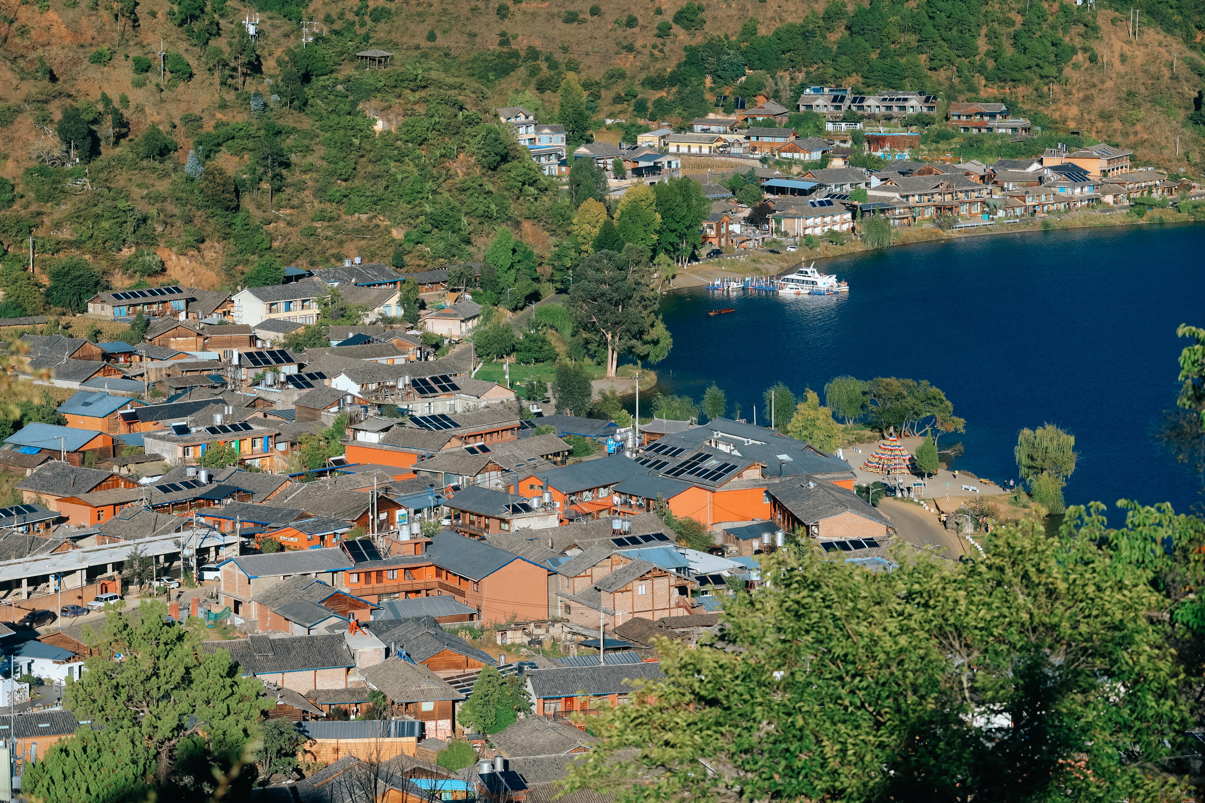 沿着环湖公路拐进来,传统的木楞房散落在缓坡上,这是纳西族的特色木质建筑,采用 全榫卯结构 建造。这里不仅拥有天然湖景和独特的东巴文化,也是野生青刺果油、野草莓、野生核桃等优质农产品的产地。