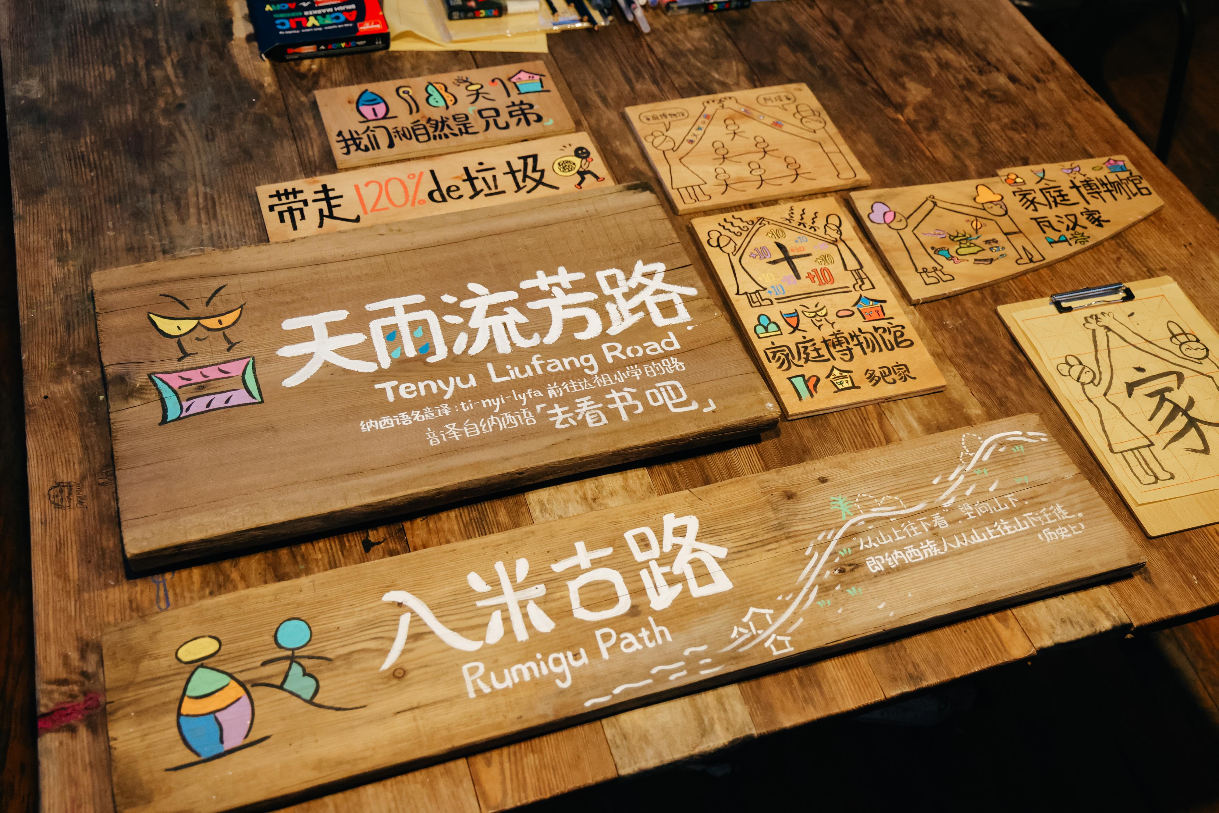 之后,人们又用村里造船与木工坊剩下的边角料做出一块块路牌,用东巴文与汉字写上路名。它们不仅指引方向,也希望让来到村里的人“每记住一个路名,就学会一句纳西语”。
