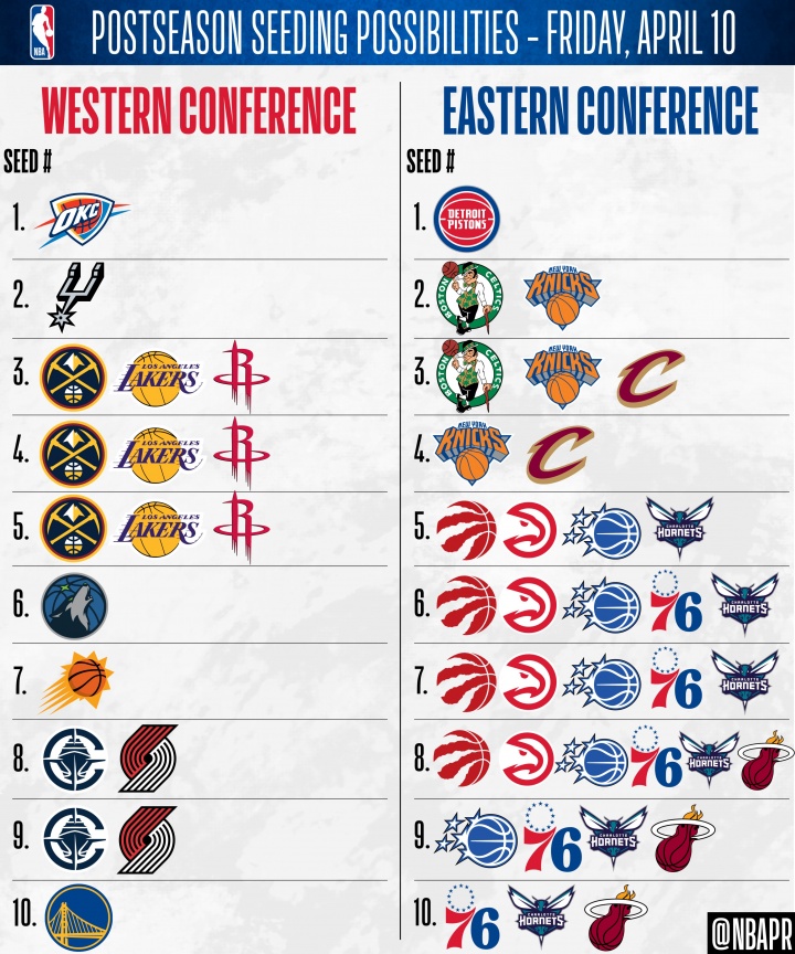 常规赛还剩余最后2场,东西部各球队季后赛+附加赛排名可能情况分析