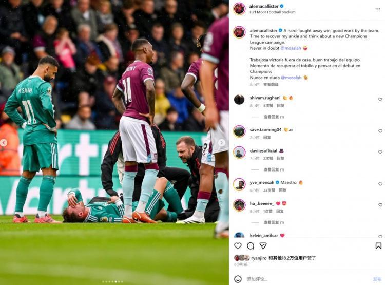本场比赛上半场遭对手乌戈丘库飞铲脚踝受伤,下半场被替换下场。麦卡利斯特在社媒写道:“一场艰难的客场胜利,全队都做的不错。现在需要尽快恢复脚踝伤势,并考虑周中的欧冠比赛。永远不要怀疑萨拉赫!”